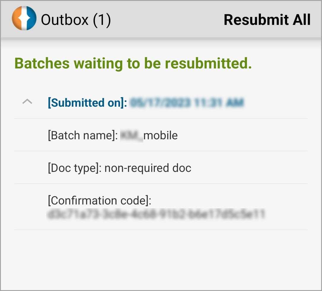 If you are offline when you tap Submit, the application will retain your captured document(s) and their associated metadata in the “Outbox” until you get back online. Submission will be automatically completed when you return online and the application is running.